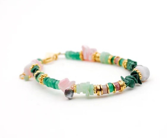 Un bracelet tendre et vibrant, composé de perles heishi aux reflets naturels et harmonieux. La malachite, la nacre rose et l'onyx vert s'y mêlent pour créer un équilibre entre ancrage, douceur et vitalité.