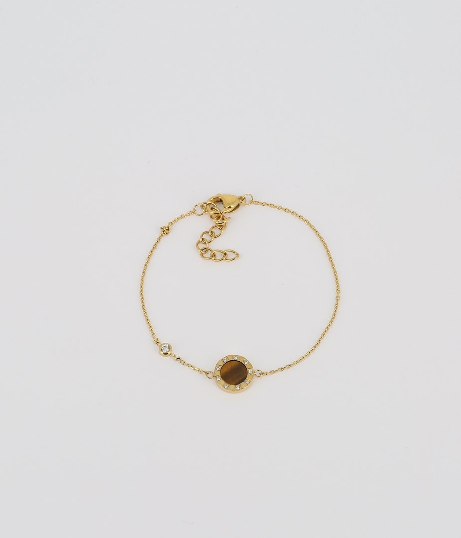 BRACELET-Louise-ACIER DORE-zirconium-oeil de tigre-15+3cm p:9mm