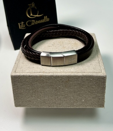 BRACELET MULTIRANG pour Homme 4 rangs CUIR TRESSE marron fermoir Slider aimanté