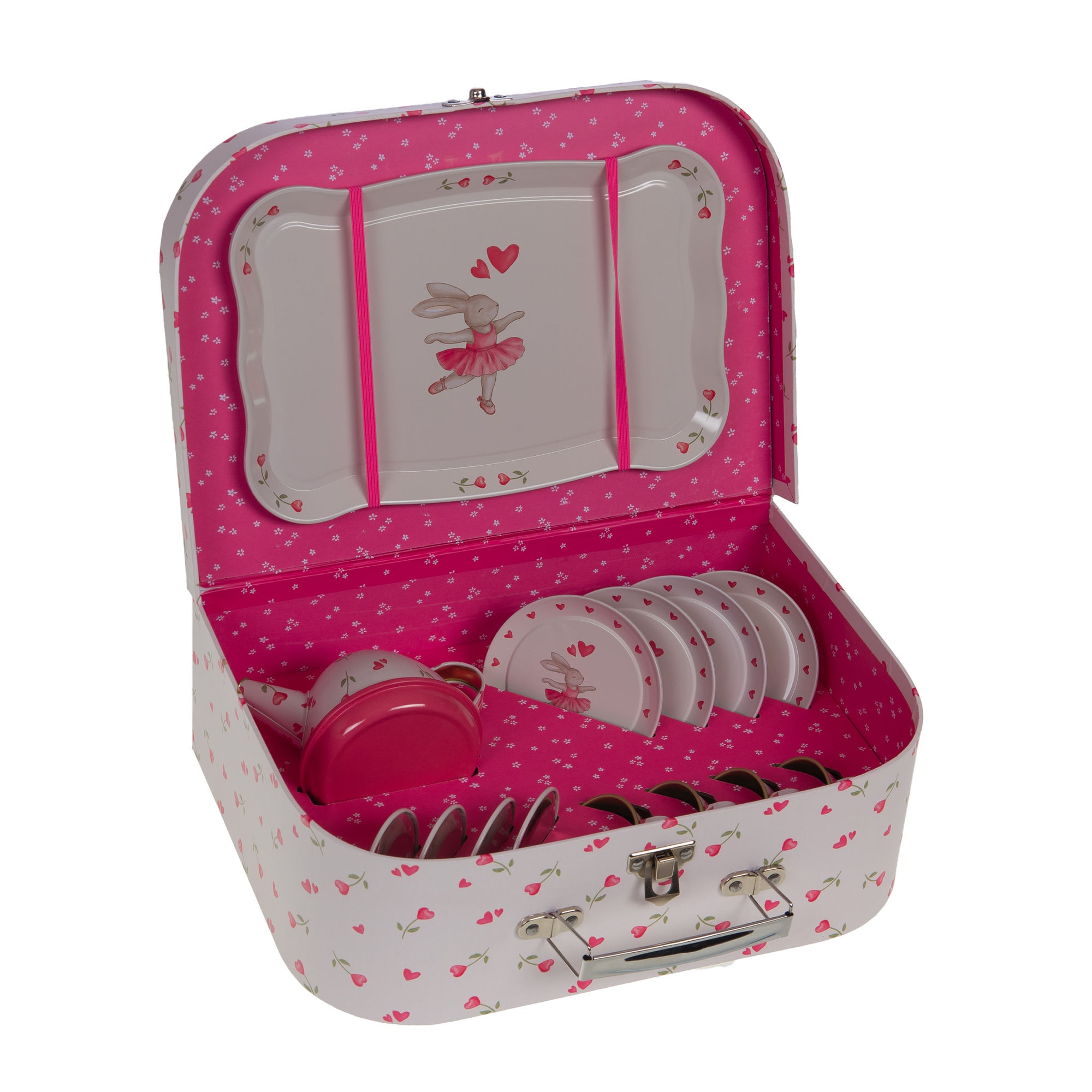 Dinette en métal et carton, présentée dans une valisette compacte (30x25x10 cm), idéale pour enrichir une gamme de jeux d'imitation pour enfants. Son design soigné avec motifs ballerine séduit une clientèle familiale à la recherche de jouets ludiques et esthétiques. Léger (360 g) et facile à transporter, ce produit favorise le jeu créatif et la socialisation.