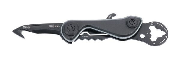 Mini outil avec 9 fonctions : déverrouillage de caddie, couteau à colis + lame en acier inoxydable 440 avec fonction d'emboîtement, porte-clés (boucle métallique), ouvre-bouteille, clé hexagonale (3 tailles), jauge de profondeur des pneus (1.6 mm). Fabriqué en acier inoxydable 440 / aluminium, de couleur noire.