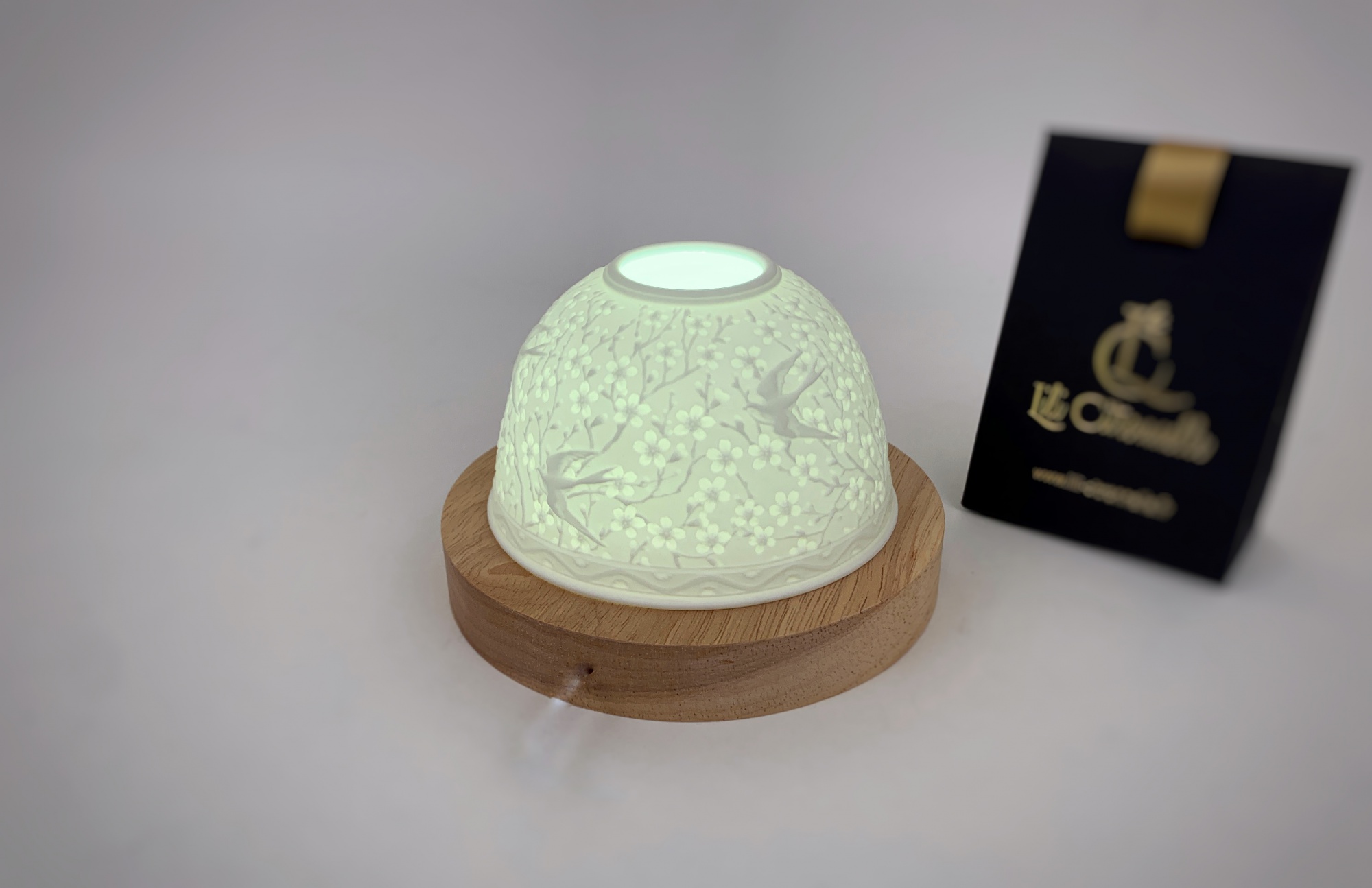 C'est une porcelaine finement ciselée qui révèle son décor une fois allumé.